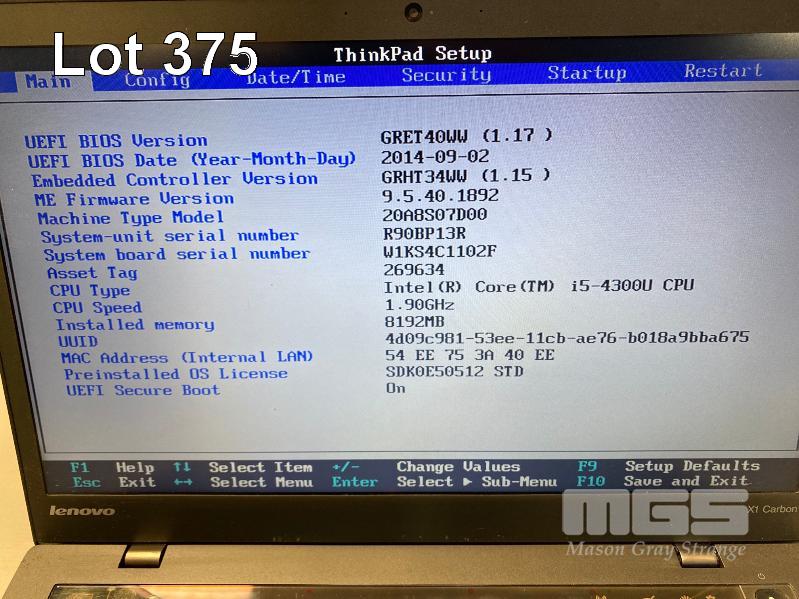 LAPTOP, LENOVO THINKPAD X1 CARBON (20A8S07D00), CORE i5 4300U (4TH GEN) @ 1.9GHz, 8GB DDR3 RAM, 256GB M.2 SSD, 14" WIDESCREEN (1600x900), INTEL HD VIDEO, Wi-Fi, BLUETOOTH, WINDOWS 10 HOME INSTALLED & POWER SUPPLY S/N:R90BP13R
