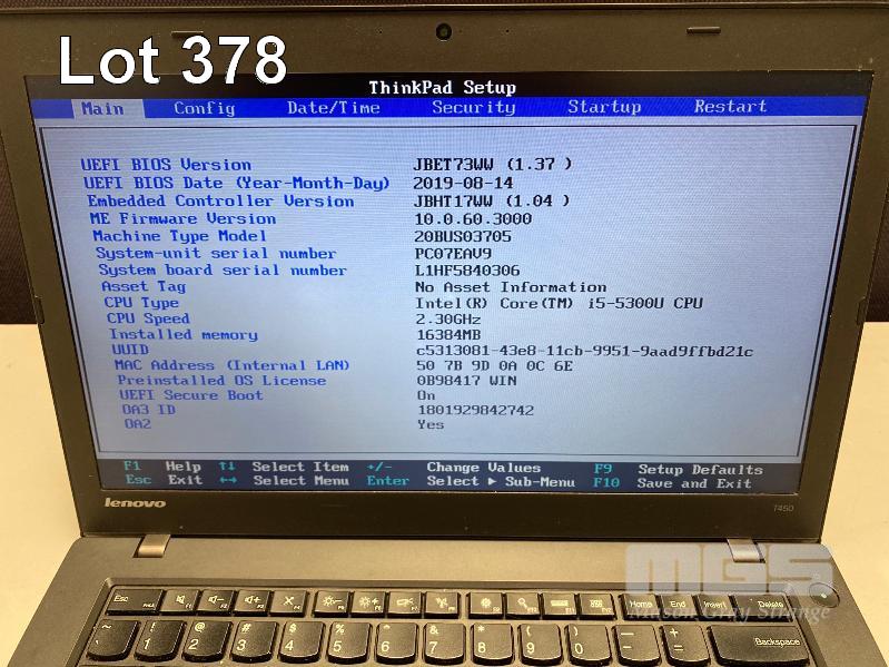LAPTOP, LENOVO THINKPAD T450 (20BUS03705), CORE i5 5300U (5TH GEN) @ 2.3GHz, 16GB DDR3 RAM, 256GB SSD, 14" WIDESCREEN (1366x768), INTEL HD VIDEO, Wi-Fi, BLUETOOTH, WINDOWS 10 PRO INSTALLED & POWER SUPPLY (NOTE: WHITE SPOT SCREEN BLEMISHES) S/N:PC07EAV9