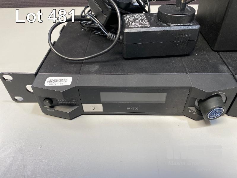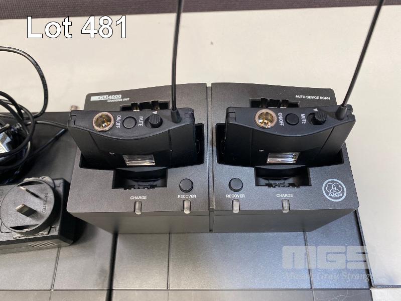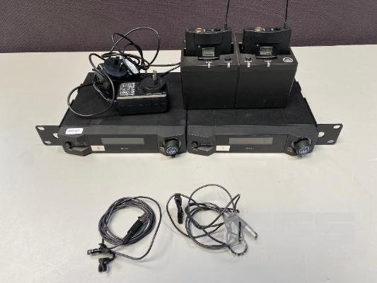 2 x AKG SR4500 STATIONERY AUDIO RECEIVERS, 2 x AKG CU4000 CHARGING STATIONS, 2 x AKG PT4500 BELT PACK TRANSMITTERS WITH 2 x MICROPHONES