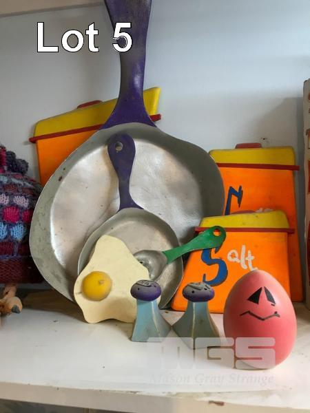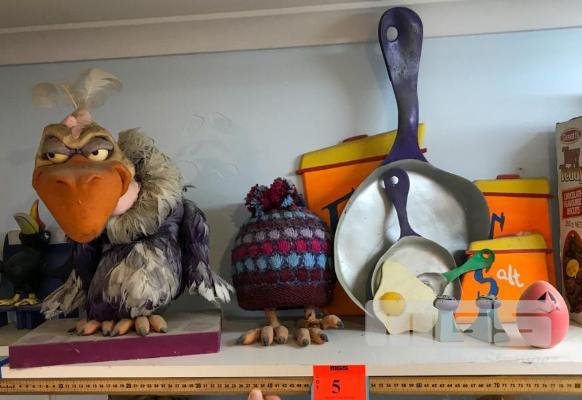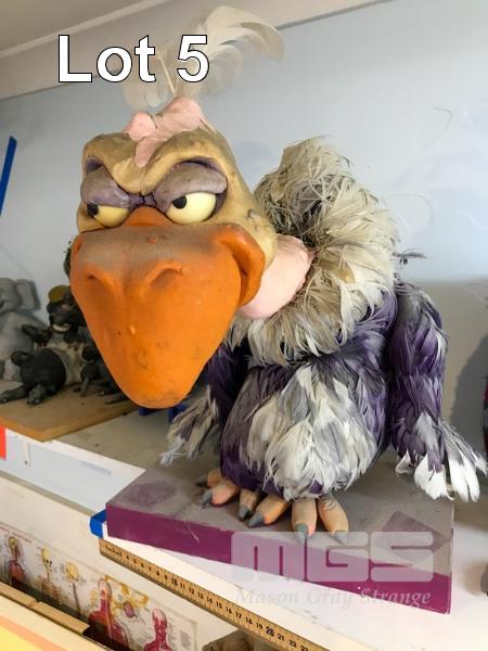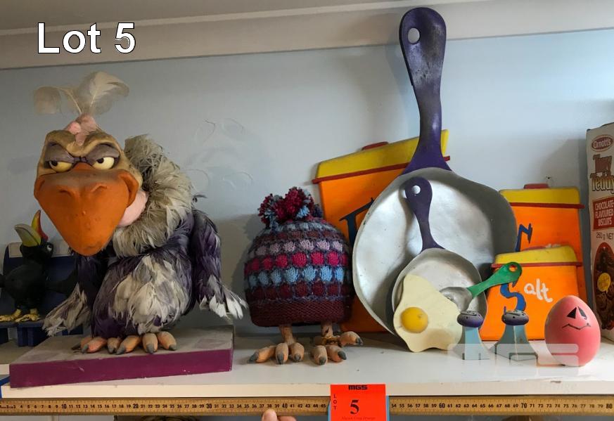 A MIXED BAG OF CHARACTERS. A CLAY AND FOAM LATEX VULTURE AND ANOTHER VULTURE HIDING UNDER A TEA COSY FROM A COTTEES JAM TV COMMERCIAL. ALSO INCLUDES A SET OF PROPS AND A CHARACTER FROM A "ME NO FRY" TV COMMERCIAL FOR SUNSCREEN. (NB: BONUS! THE WINNING BIDDER WILL RECEIVE A LINK TO THE COTTEES TV COMMERCIAL.)