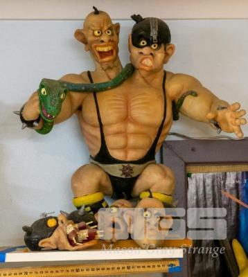 IMPRESSIVE LARGE FOAM LATEX, TWO HEADED WRESTLER WITH SNAKE FROM A PADDLE POP LION TVC. LOT INCLUDES REPLACEMENT HEADS. NB: NOT A TOY