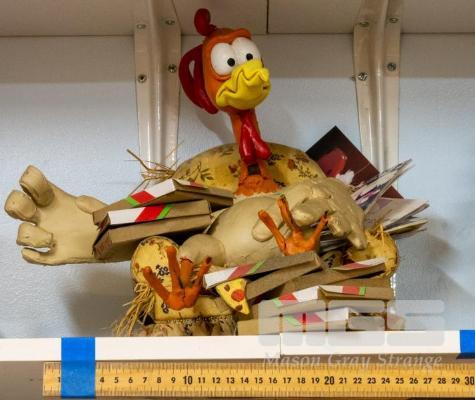 CLAY PIZZA EATING CHICKEN IN AN ARM CHAIR. SHOT FOR TAIKOO SUGAR IN HONG KONG. (CIRCA 2001.) NB: NOT A TOY