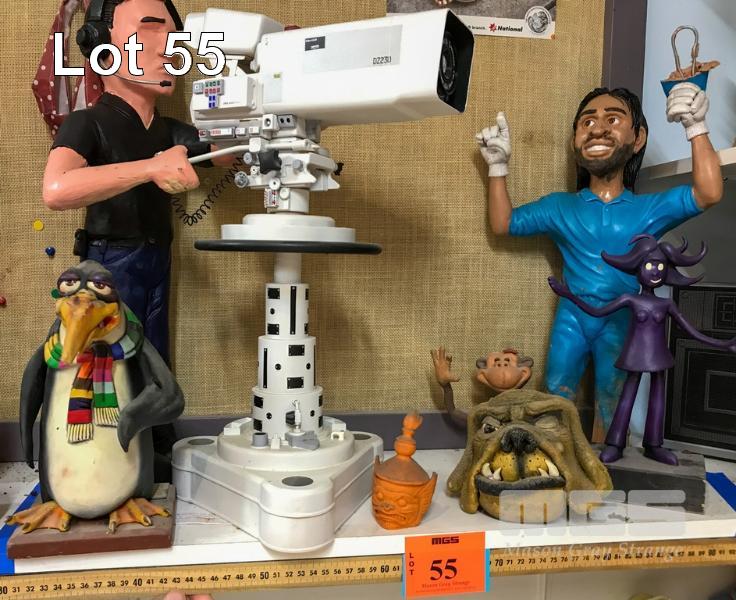 MIXED BAG OF CHARACTERS. THE PENGUIN IS A PAINTED CLAY PITCH MODEL FOR A TV COMMERCIAL WHICH DID NOT GO AHEAD. THE TV CAMERA AND OPERATOR WERE FROM A SERIES OF SHORT FILMS BASED ON JOE PESCI. THE BULLDOG HEAD IS FLOCKED CLAY AND WAS FROM A CARRIER TVC. THE CRICKETER IS MS DHONI AND WAS A PITCH MODEL FOR A TVC OUT OF INDIA. THE PURPLE WOMAN WAS A FIRST DESIGN (UNUSED) FOR "THE BUZZ" TVC'S