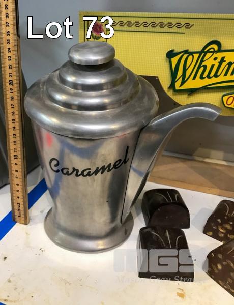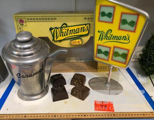 PROPS AND MODELS FROM A WHITMANS TVC. INCLUDES A BEAUTIFUL (NON FUNCTIONING) BESPOKE, SOLID ALUMINIUM POURER. NOTE: THE WORD "CARAMEL" IS A STICK ON GRAPHIC AND CAN BE REMOVED. ALSO INCLUDED ARE A TABLE SIGN, A PROP CHOCOLATES BOX AND SOME HARD COPIES OF THE CHOCOLATES
