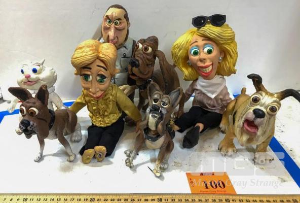 SCHMACKO'S COLLECTION OF ANIMATION PUPPETS FEATURING THE CAT, BOSCO THE BOXER (X2) CROSBY THE BLOODHOUND AND OSCAR THE BULLDOG WITH TWO OF THE OWNERS AND A BACKGROUND CHARACTER. THESE WERE USED ON THE SCHMACKO'S MOVIE " A DOG OF A DAY." (NB: BONUS! THE WINNING BIDDER WILL RECEIVE A LINK TO THE TV COMMERCIAL.) NB: THESE ARE NOT TOYS
