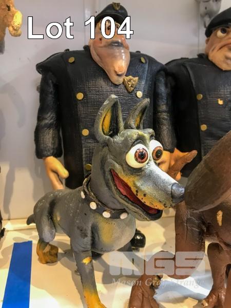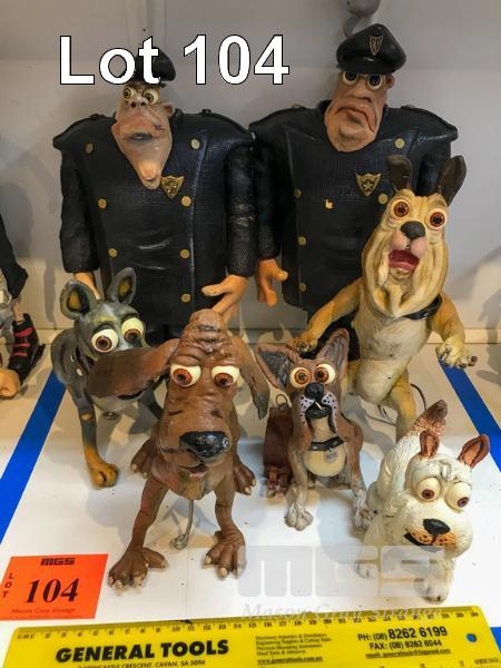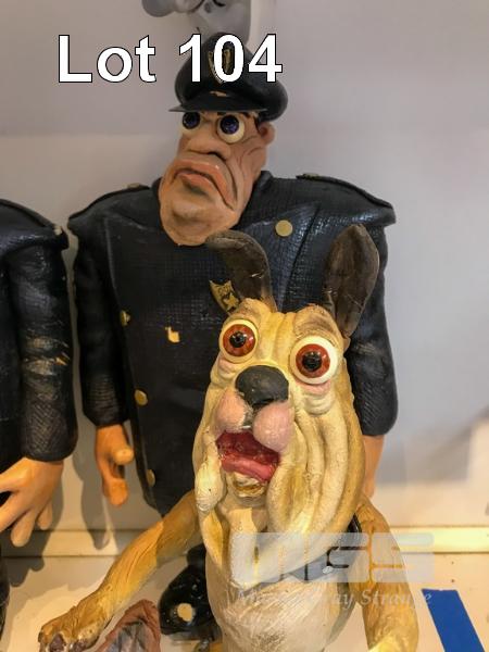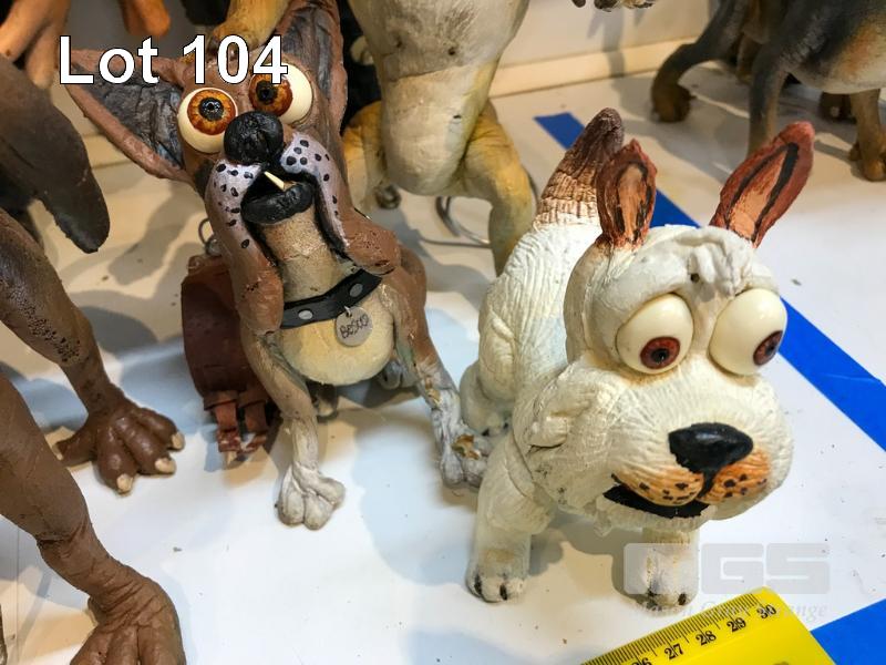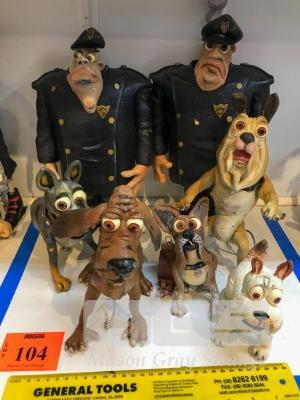 SCHMACKO'S CHARACTERS FROM THE SCHMACKO SHORT FILM "A DOG OF A DAY." LOT INCLUDES ANIMATION MODELS OF BLUEY THE BLUE HEELER, BOSCO THE BOXER, CROSBY THE BLOODHOUND, OSCAR THE BULLDOG AND MAX, THE WEST HIGHLAND WHITE TERRIER. THERE ARE ALSO TWO RATHER THUGGISH LOOKING COPS. ALL CHARACTERS ARE IN FOAM LATEX. THESE ARE NOT TOYS