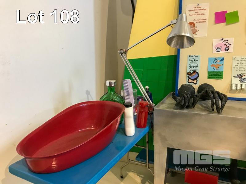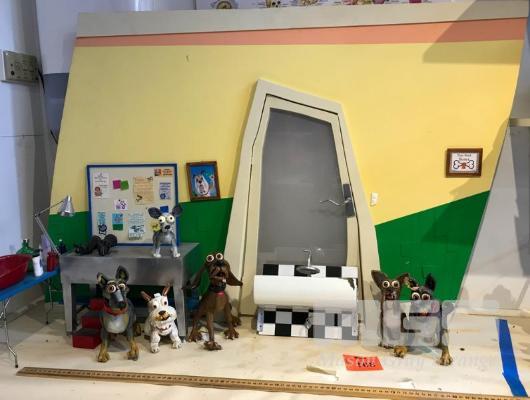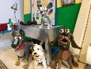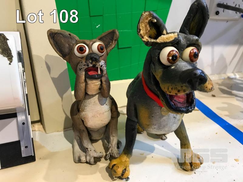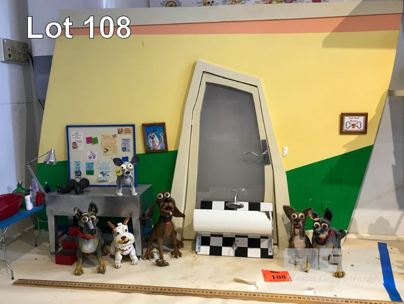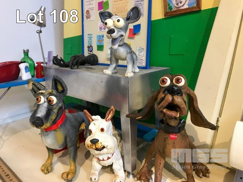 SCHMACKO'S SET PIECE FROM THE TVC "GROOMER." LOT INCLUDES THIS DISTORTED SET, A B&W VERSION OF THE TERRIER ROGER, 2X BLUEY THE BLUE HEELER, CROSBY THE BLOODHOUND, BOSCO THE BOXER AND MAX, THE WEST HIGHLAND WHITE TERRIER. ALSO INCLUDES PROPS AND TABLE. THESE ARE NOT TOYS