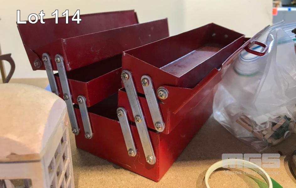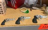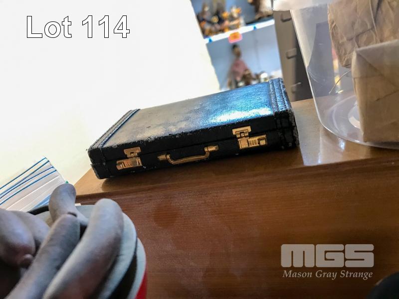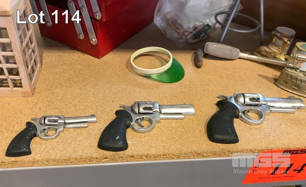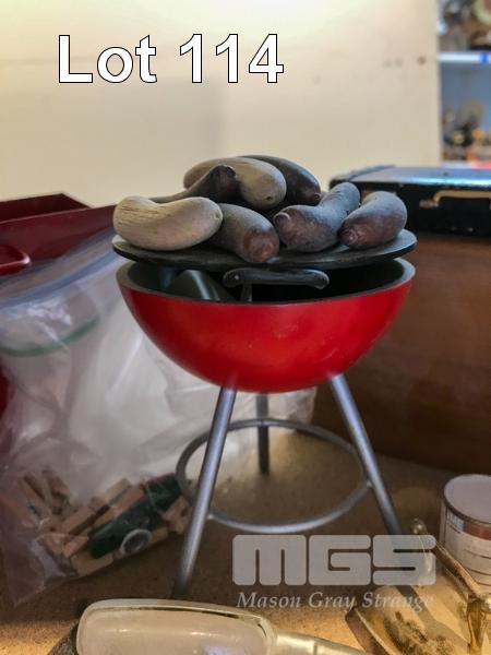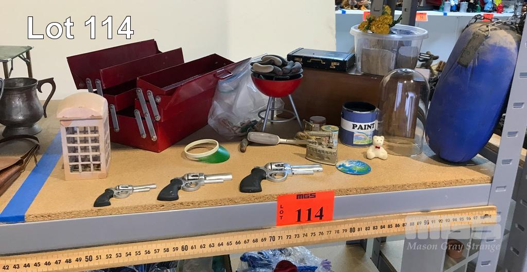 AN ASSORTMENT OF PROPS. LOT INCLUDES A BEAUTIFUL OPENING MINIATURE TOOL BOX, MINIATURE PUNCH BAG, BBQ AND "THREE FLYING DUCK" GUNS. THERE IS ALSO THE PROTOTYPE FOR THE ENGLISH TELEPHONE BOX AS SEEN IN THE PASCALL'S PINEAPPLE LUMPS COMMERCIAL. NB: THAT THE GLASS DOME ON THE RIGHT HAS BEEN WITHDRAWN. THESE ARE NOT TOYS