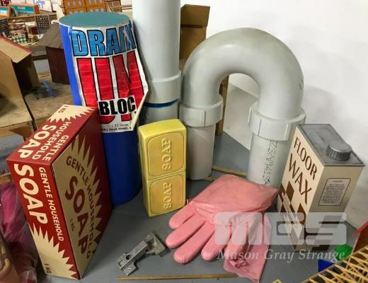 LOUIE THE FLY BIGATURES. PROPS USED UNDER THE SINK. INCLUDES GIANT BAR OD SOAP AND GIANT RUBBER GLOVE
