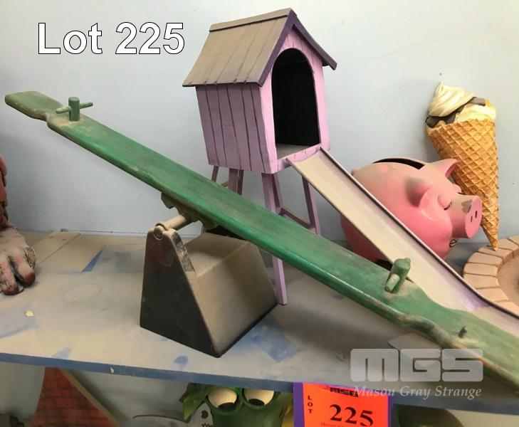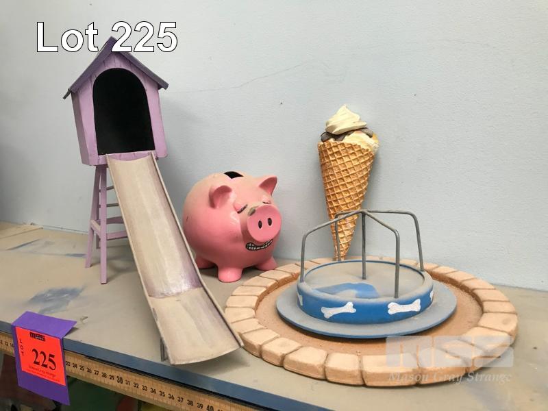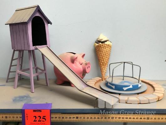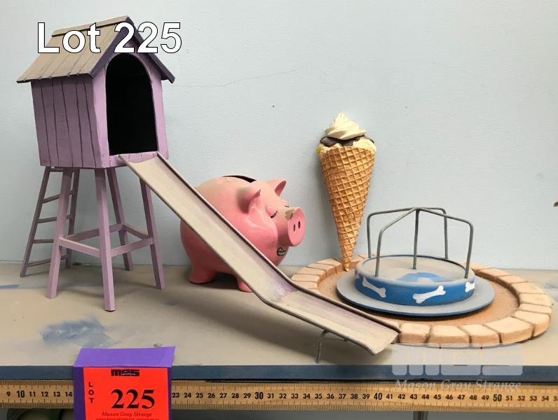 ASSORTED PROPS. THE PIG MONEY BOX IS NOT A PRACTICAL PROP. THE PLAYGROUND EQUIPMENT IS FROM THE SCHMACKO'S MOVIE "A DOG OF A DAY." (NB: BONUS! THE WINNING BIDDER WILL RECEIVE A LINK TO THE FILM.)