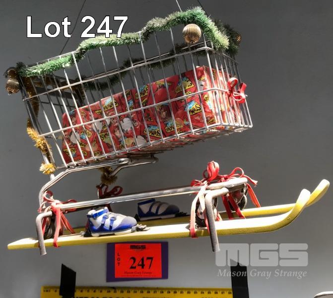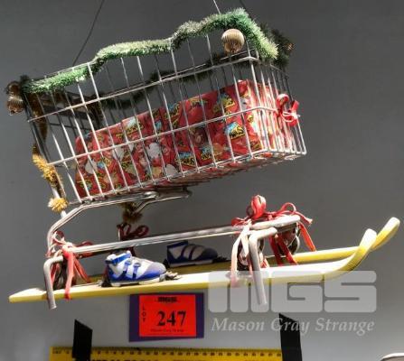 SCHMACKO'S SHOPPING TROLLEY WITH MINIATURE PRODUCT PACKAGING. THE TROLLEY IS ON A SET OF SKIS. (THIS WAS USED IN THE SCHMACKO'S CHRISTMAS TVC OF CIRCA, 2005.)