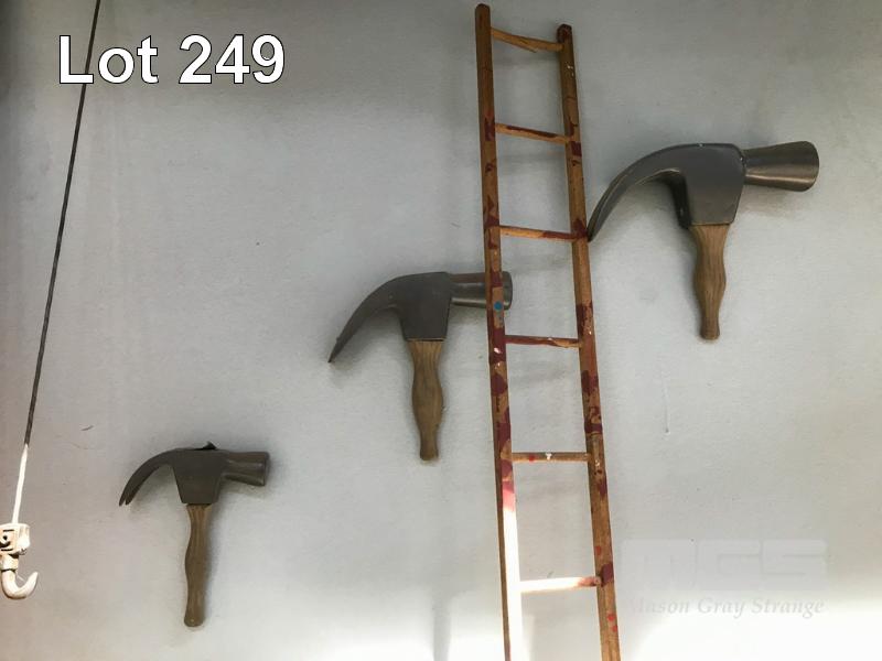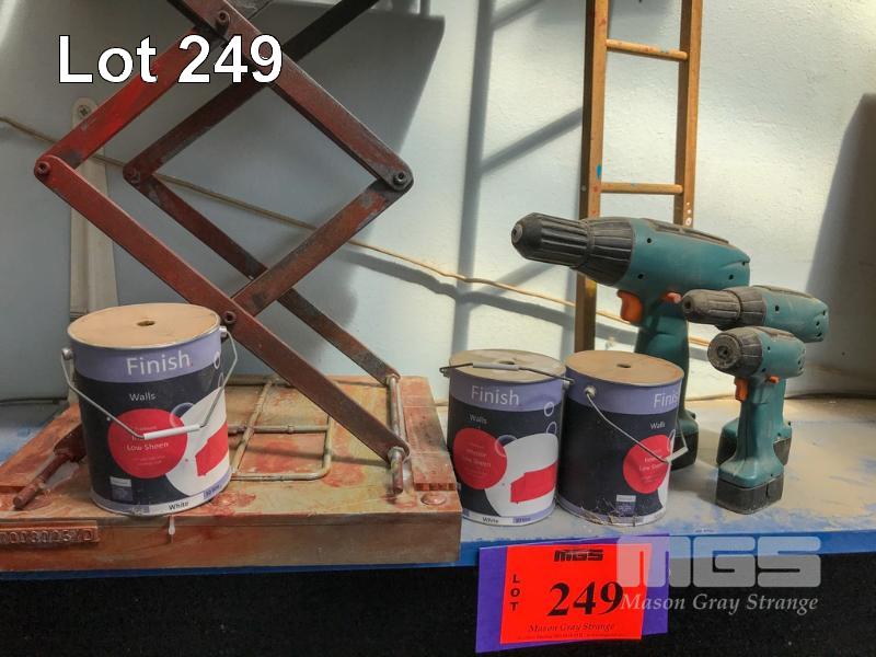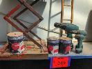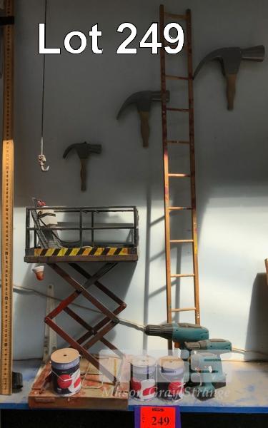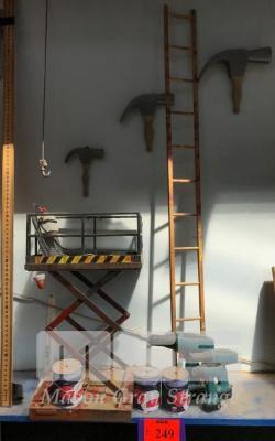 ASSORTED HOME HARDWARE MINIATURES. LOT INCLUDES SEVERAL SCALE DRILLS, A WOODEN LADDER AND A DETAILED SCISSOR LIFT PLATFORM WHICH WAS ALSO USED ON THE AWARD WINNING ANIFEX SHORT FILM, "MEANWHILE, AT THE ABANDONED FACTORY..."