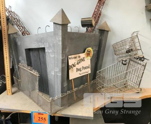 MODEL DOG POUND FROM THE SCHMACKO'S SHORT FILM "A DOG OF A DAY." ALSO INCLUDED ARE TWO MINIATURE SHOPPING TROLLEYS FROM THE SCHMACKO'S TVC "BREAKOUT." NB: NOT A TOY