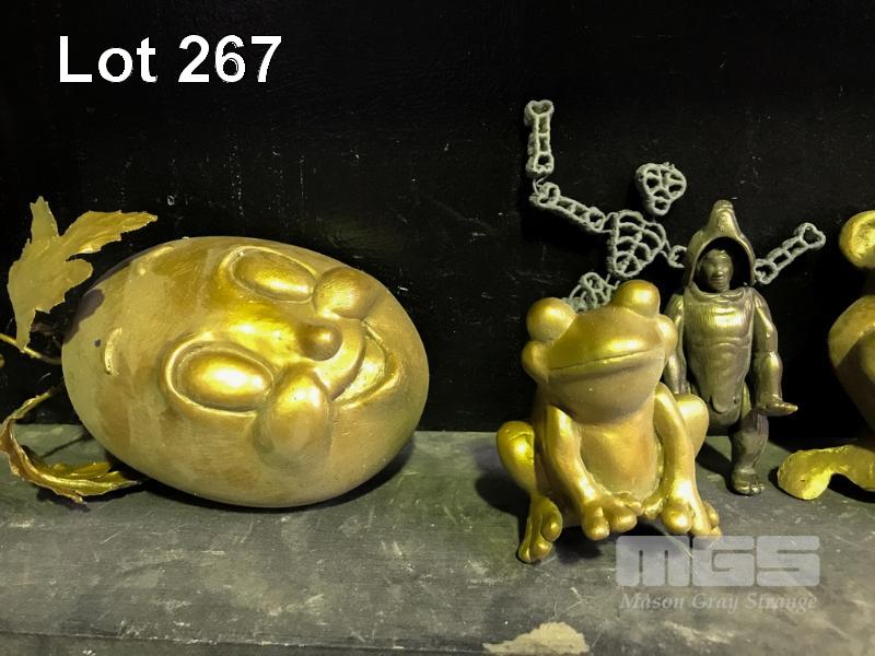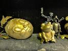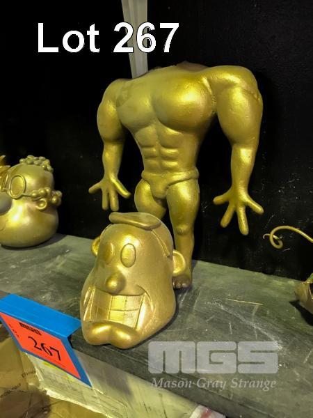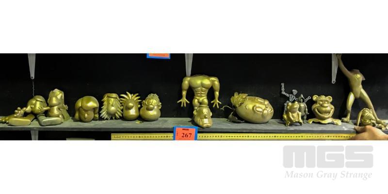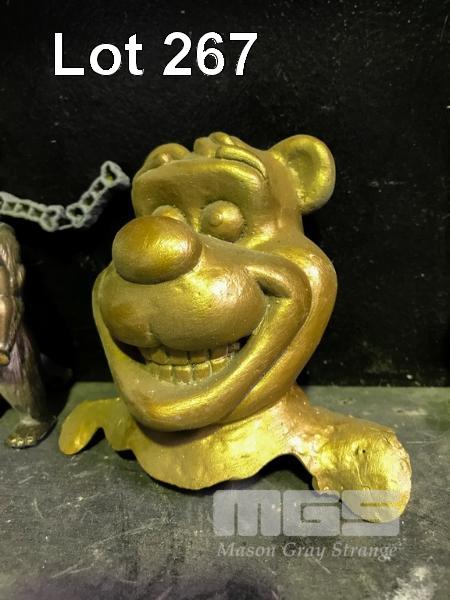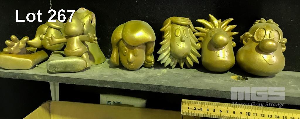 HARD GOLD PAINTED COPIES OF TV COMMERCIAL CHARACTERS. MR. RENTAL. THE BUZZ, SCHMACKO'S, KARICARE BEAR AND TWISTIES "BAG O' BONES