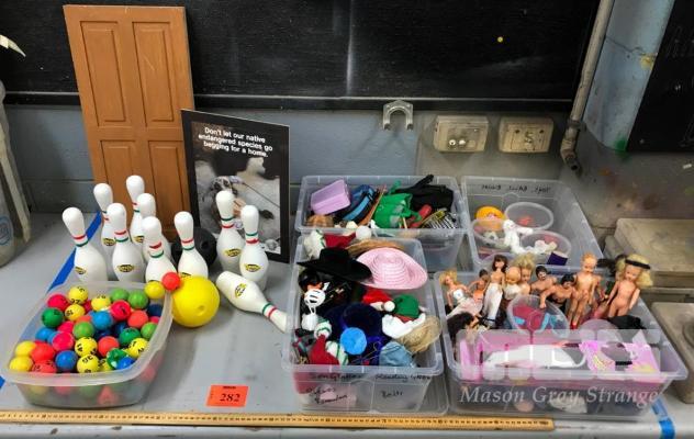 ASSORTED PROPS. INCLUD. PING PONG BALLS, MINIATURE HAT SELECTION, AN ASSORTMENT OF BAGS AND MASS PRODUCED DOLLS