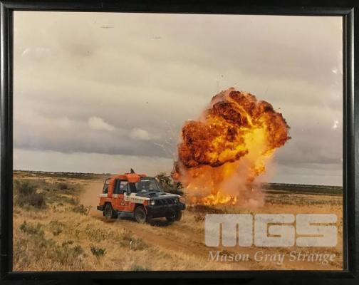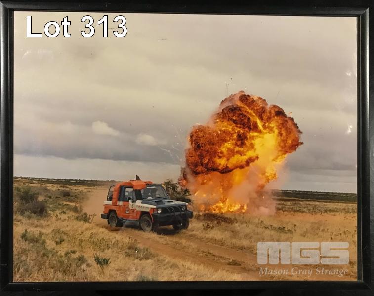 UNIQUE ULTRAMAN MEMORABILIA. FRAMED PHOTO OF EXPLOSION NEXT TO A HUMMER FROM "ULTRAMAN: TOWARDS THE FUTURE": (EPISODE 6: "THE SHOWDOWN." )