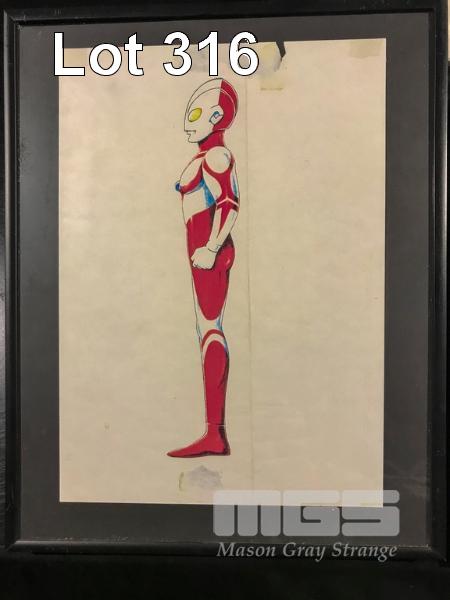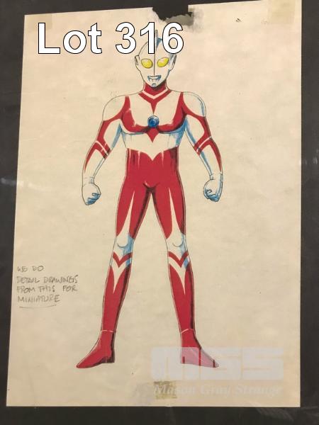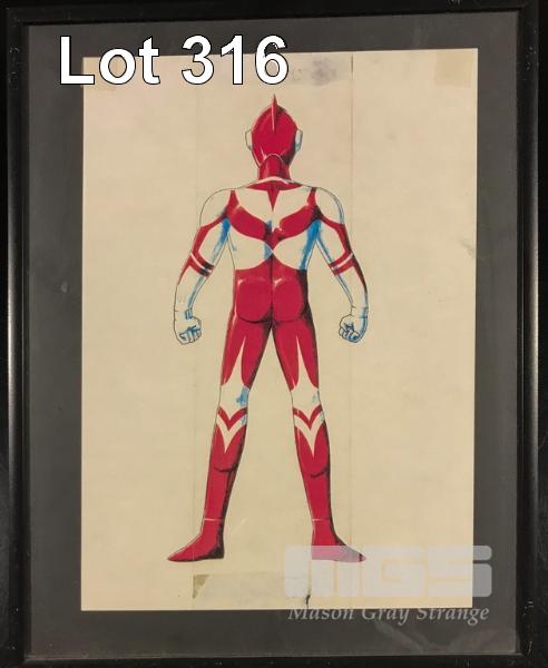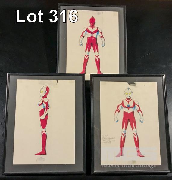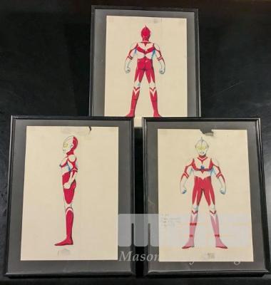 UNIQUE ULTRAMAN MEMORABILIA. 3 FRAMED PICTURES OF ULTRAMAN: TOWARDS THE FUTURE THAT WERE USED AS A STYLE GUIDE FOR THE COSTUME
