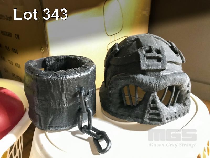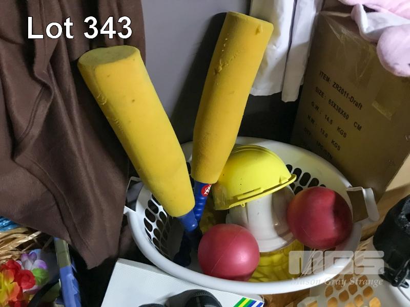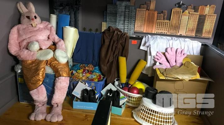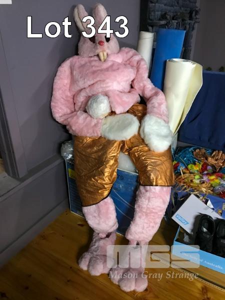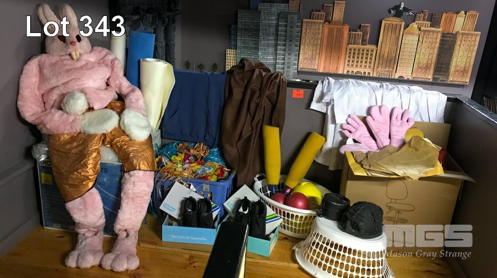 MIXED LOT. A BROWN CLOAK, COSTUME HANDS, 6 WHITE LAB COATS, A BULL COSTUME PATTERN, A FULL SIZED RABBIT COSTUME (FROM AN ENERGISER TV COMMERCIAL) SOFT BATS AND BALLS, CRASH HATS, GRASS SKIRTS AND LAYS, COSTUME FABRIC, STUFFING AND FOAM. DUNLOP VOLLEY SPORTS SHOES (BRAND NEW IN BOXES) SIZES 6 AND 11