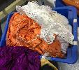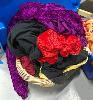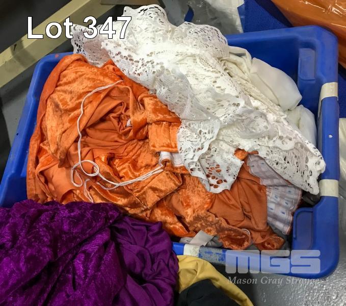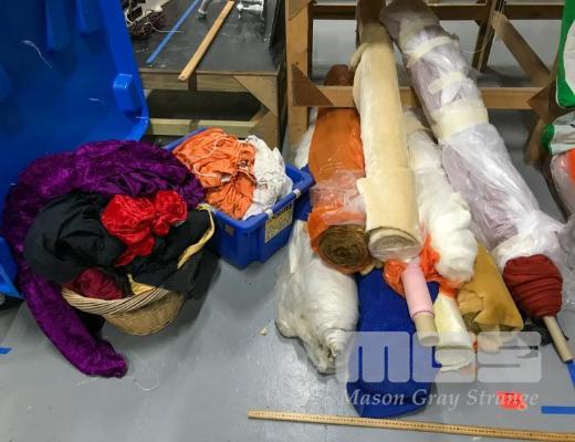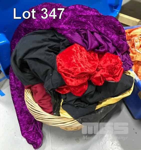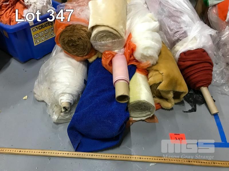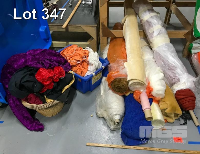 ASSORTED LARGE ROLLS OF FAUX FUR, UPHOLSTERY FABRIC, ASSORTED LARGE RED VELVET CURTAINS AND LACE CURTAIN FABRIC. CANE BASKET