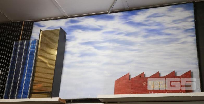 STRETCHED CANVAS SKY BACKDROP. (APPROX. 4M X 1.7 M) PLUS MINIATURE BUILDINGS. (THIS ITEM TO BE COLLECTED MONDAY 1st MARCH)