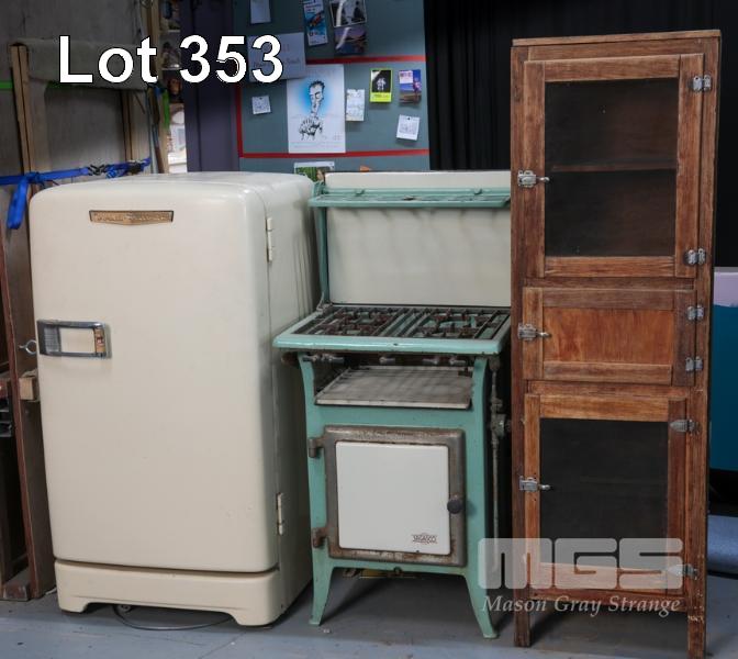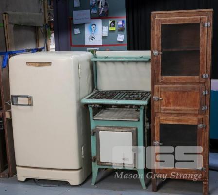 VINTAGE MEATSAFE (1.7 H X 520 W X 370 D) FRIDGE ( 1.340 H X 700 W X 630 D) STOVE (1.350 H X 640 W X 590 D) LOT INCLUDES ROLL OF INDUSTRIAL LINO AND OFFCUTS. AS USED ON THE SHORT FILM "EGGS!"
