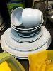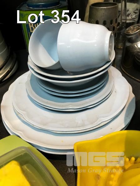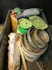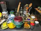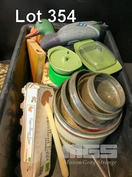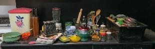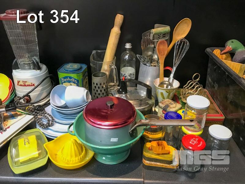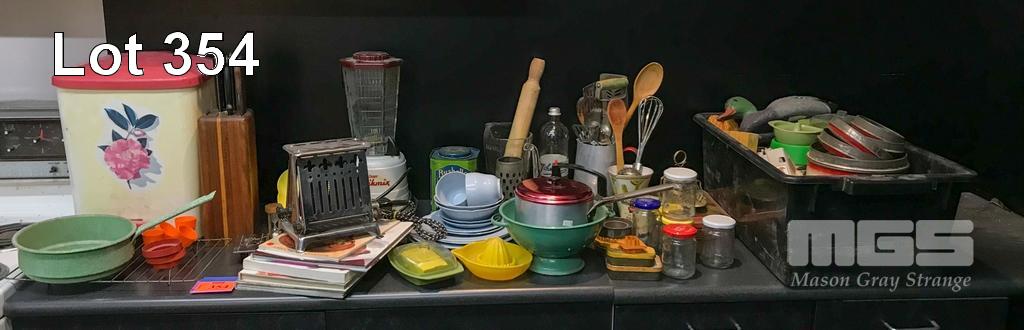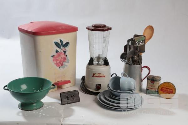 COLLECTION OF VINTAGE KITCHEN ITEMS USED IN THE SHORT FILM "EGGS!" A FLIP TOP BIN, COLLANDER, MIXER, CROCKERY, KITCHEN UTENSILS AND TINS