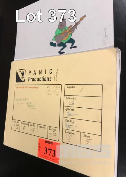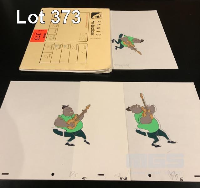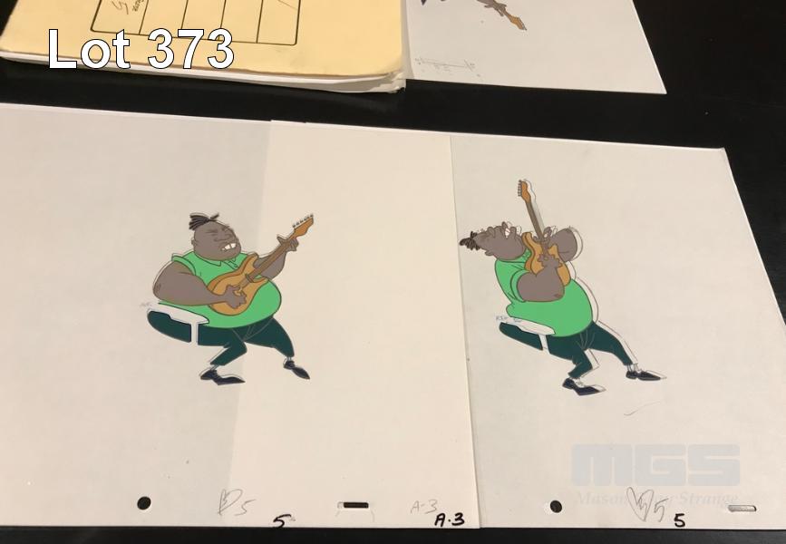 GUITARIST. TRADITIONAL HAND PAINTED CEL ANIMATION SEQUENCE FROM THE SHORT ANIMATED FILM "HEARTBREAK MOTEL." MANY INCLUDE PENCIL DRAWINGS OF CEL