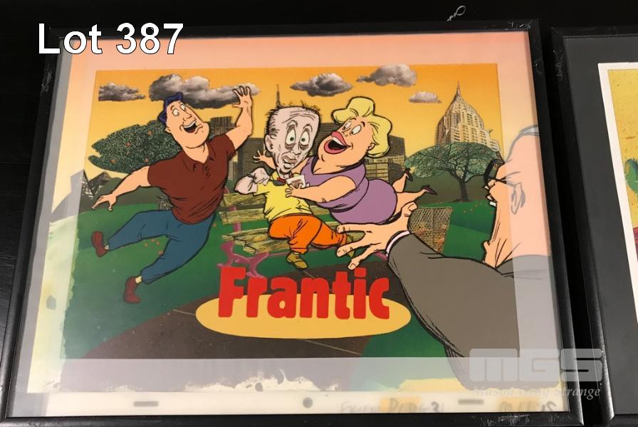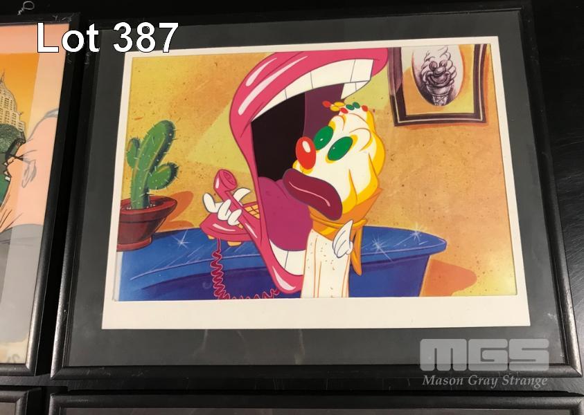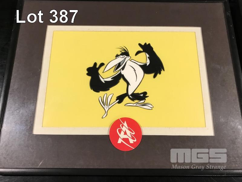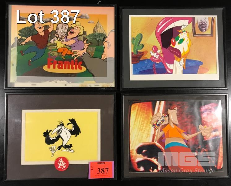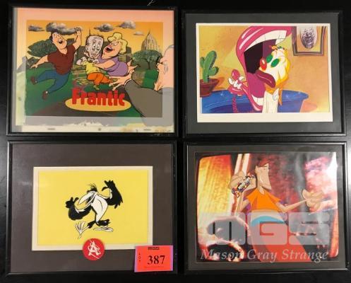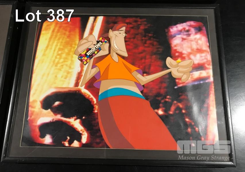4 FRAMED TRADITIONAL HAND PAINTED ANIMATION CELS ON ORIGINAL BACKGROUNDS FOR SMARTIES, FRUCHE, SIP N' SAVE AND WENDYS