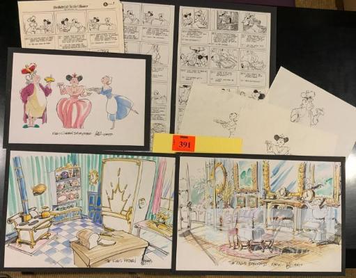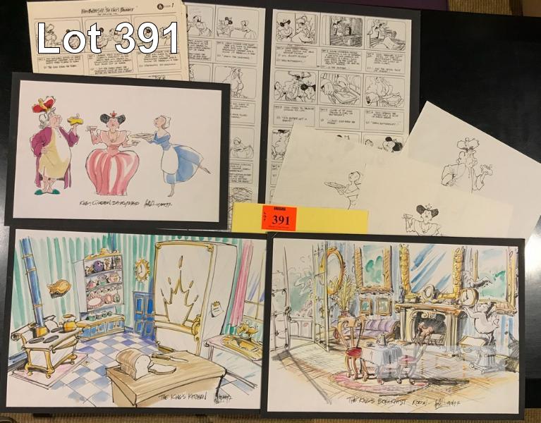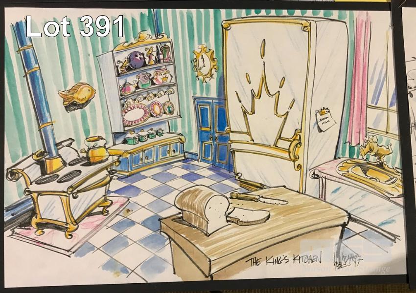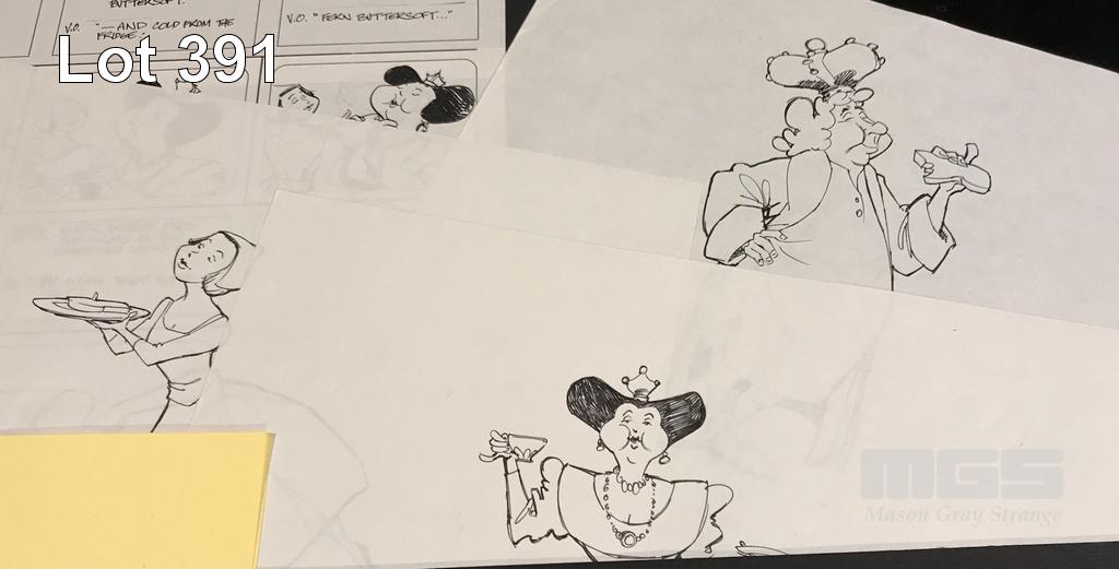 DESIGNS FOR FERN BUTTERSOFT TVC. DELIGHTFUL SET AND CHARACTER ILLUSTRATIONS. ALSO INCLUDES A LARGE B&W STORYBOARD