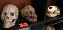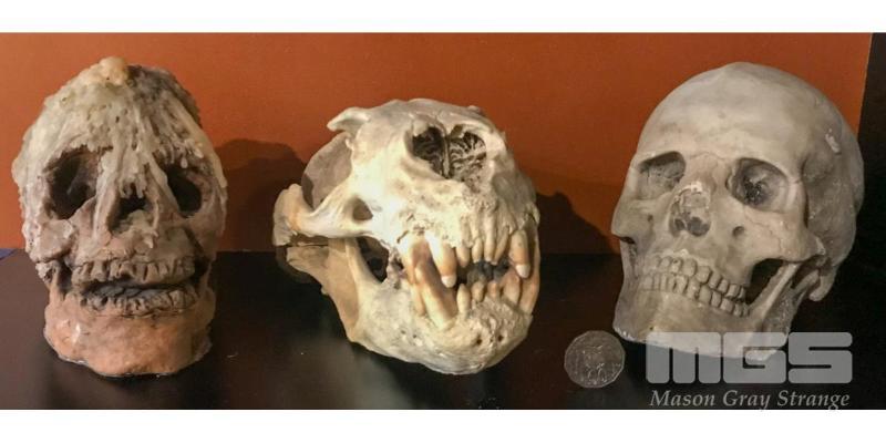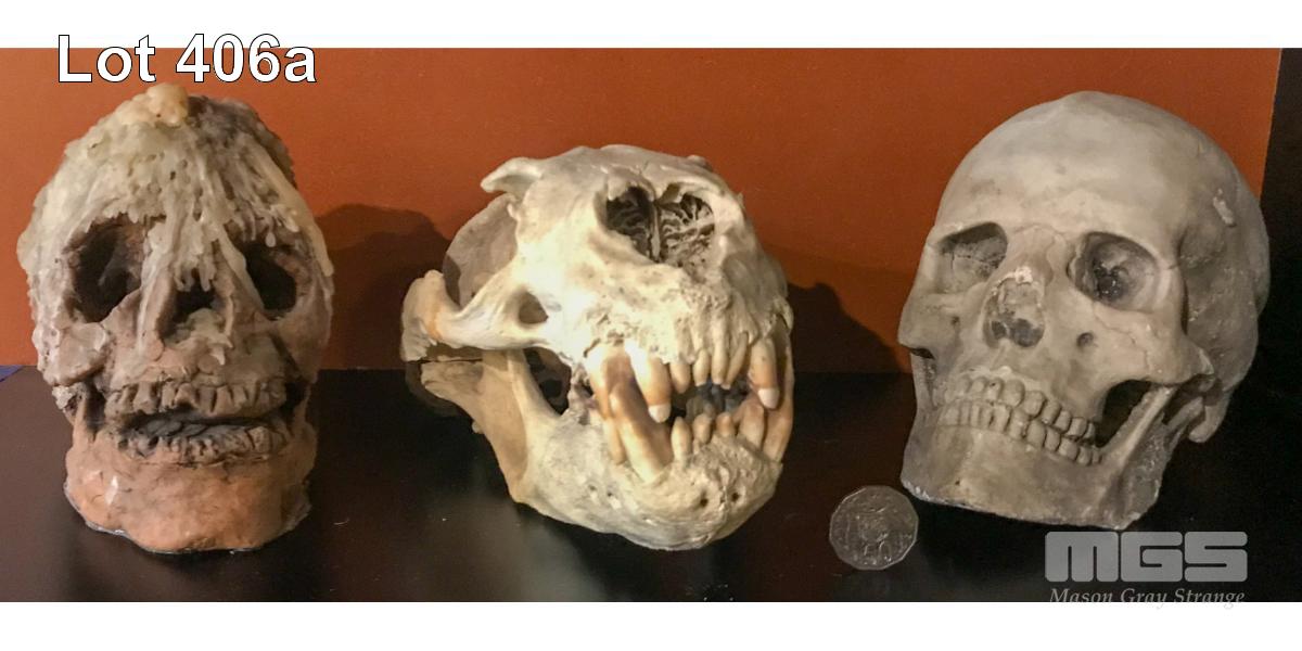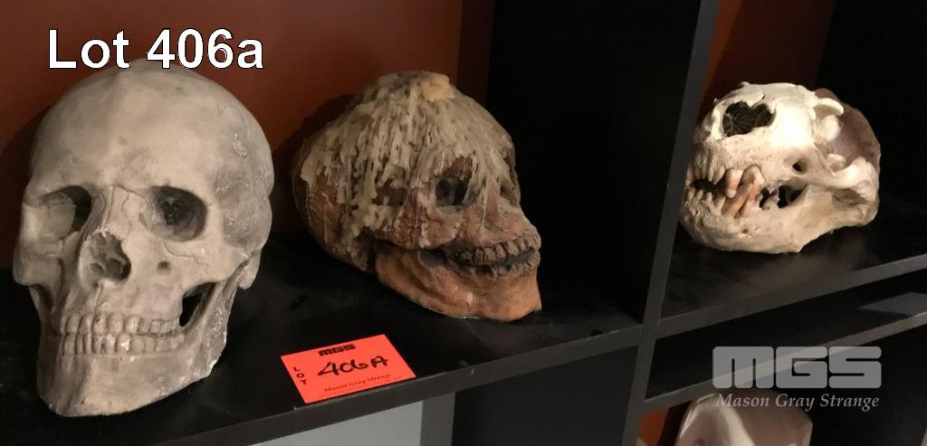 3 X SKULLS. 1 CONCRETE HUMAN SKULL, I CERAMIC CLAY SORCERER'S SKULL AND 1 REAL SEA LION SKULL