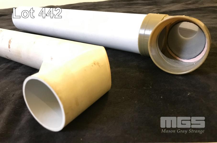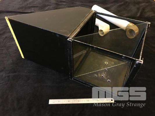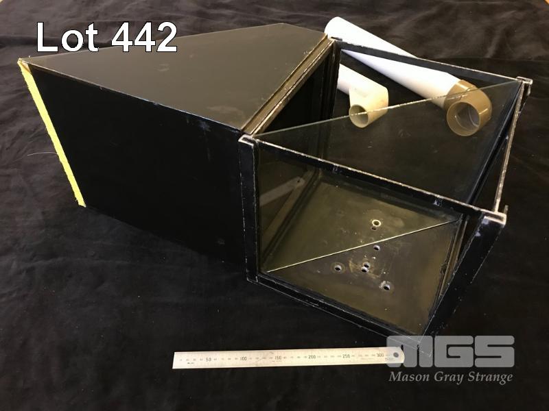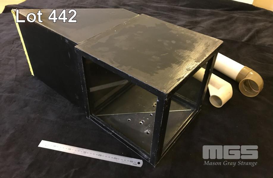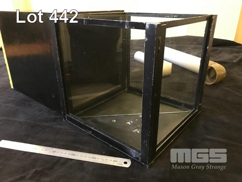"GHOST GLASS" LIGHT SPLITTER BOX. USED IN THE FEATURE FILMS "INCIDENT AT RAVEN'S GATE" (LIGHTNING ON THE HORIZON) AND "PLAYING BEATIE BOW." (MAGICAL GLOW ON A COLLAR) THIS WAS ALSO USED TO CREATE GLOWING GREEN MAKE UP ON GIA CARRIDES (JEAN ECHO) ON "ULTRAMAN: TOWARDS THE FUTURE." LOT ALSO INCLUDES TWO SIMPLE PERISCOPES.