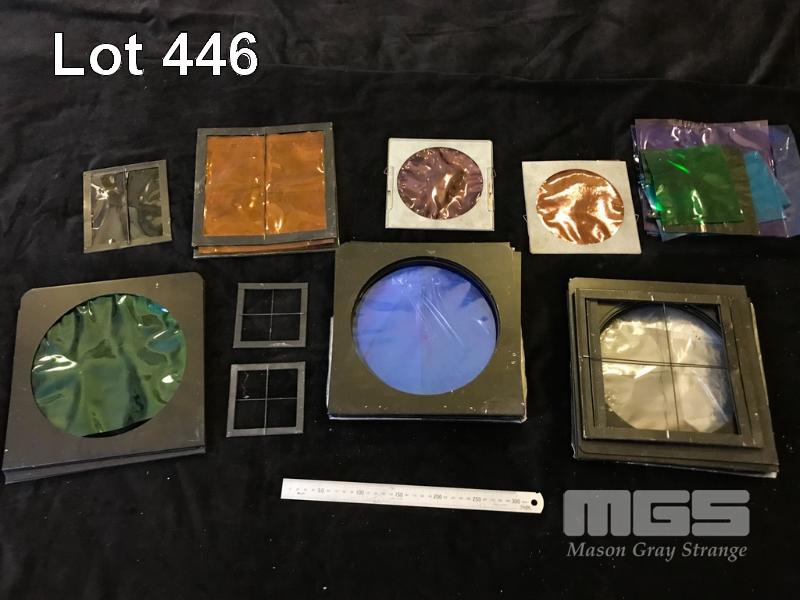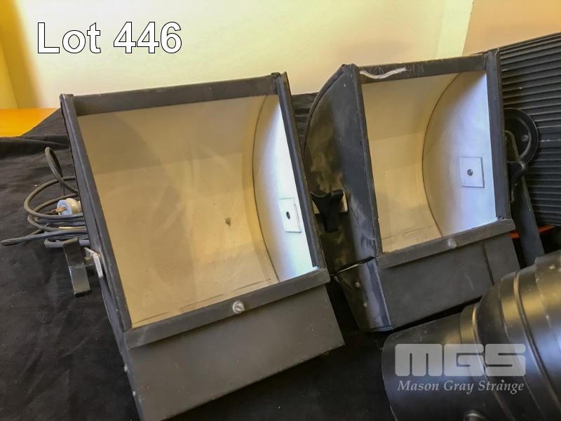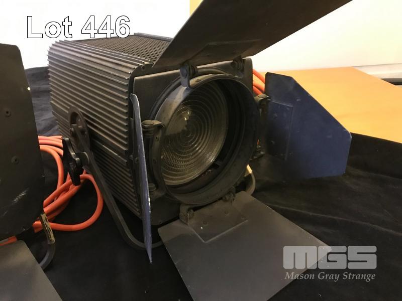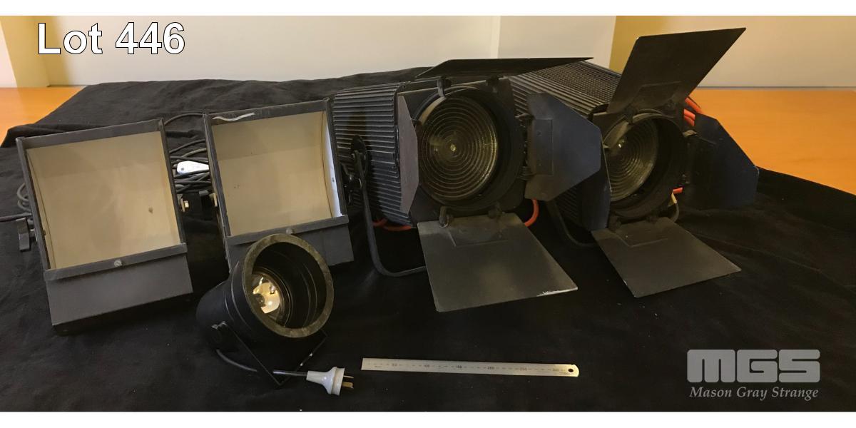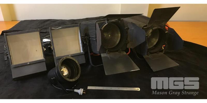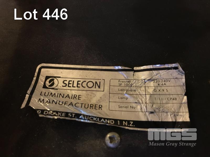 2 X SELECON 1200 WATT FRESNEL STUDIO LIGHTS WITH FILTERS. 1 X SPOT CAN LIGHTS.