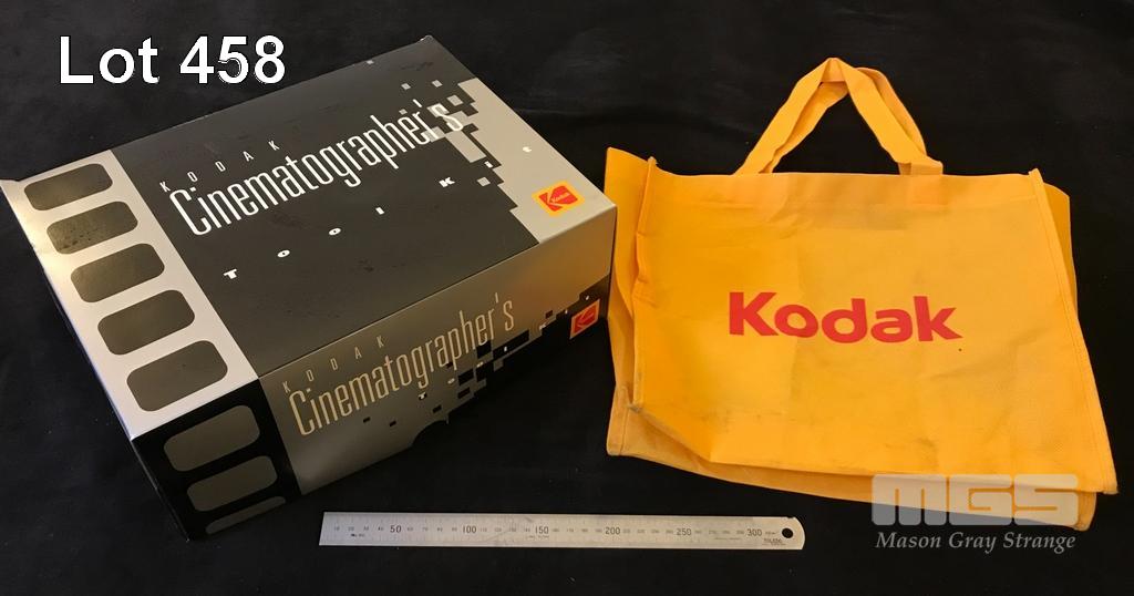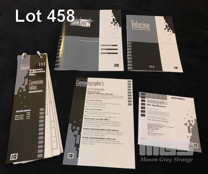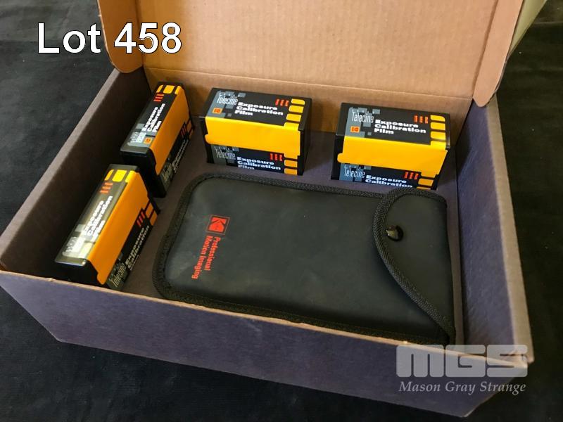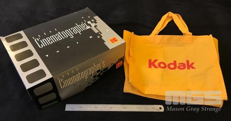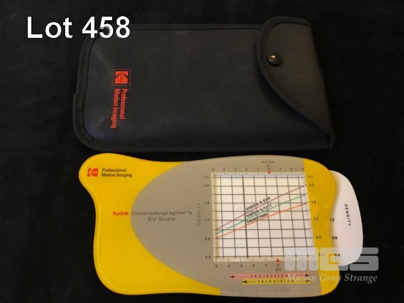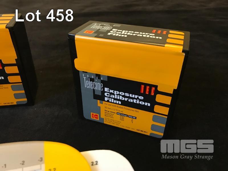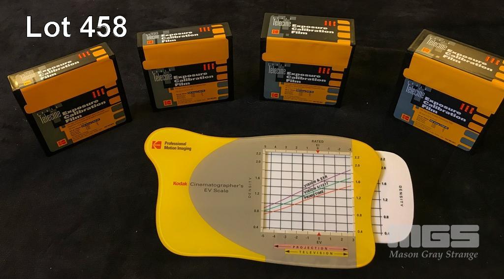 COLLECTOR'S ITEM: KODAK TELECINE EXPOSURE CALIBRATION KIT. PRISTINE CONDITION. 35MM AND 16MM SEALED CALIBRATION ROLLS. SLIDING EV SCALE WITH PROTECTIVE POUCH
