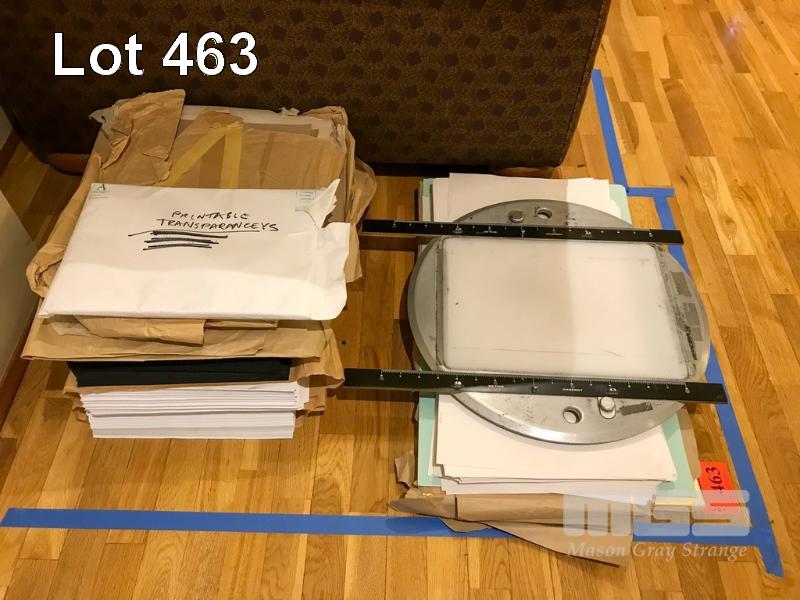 TRADITIONAL 2D ANIMATION ADJUSTABLE PEG BAR DRAWING DISC. LOT INCLUDES SELECTION OF ACETATE CELS, AND PRE-PUNCHED ANIMATION PAPER. PRISTINE GREEN "ANIFEX" CEL FOLDERS AND PRE-PUNCHED BLACK PAPER CELS