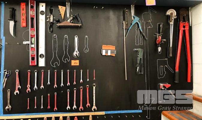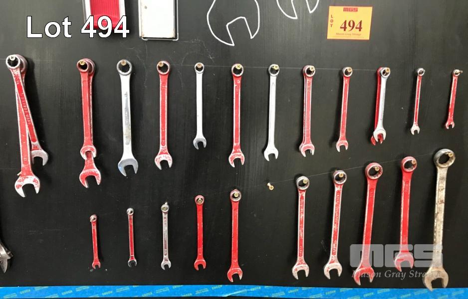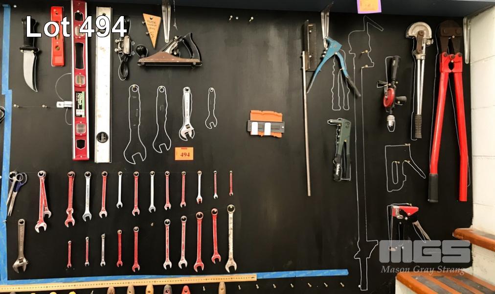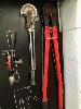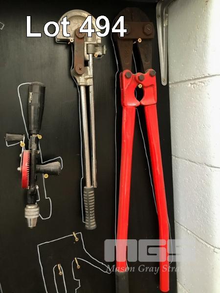 ASSORTED WORKSHOP TOOLS. INCLUDING SPANNERS, SPIRIT LEVELS, PIPE BENDER AND LARGE BOLT CUTTERS