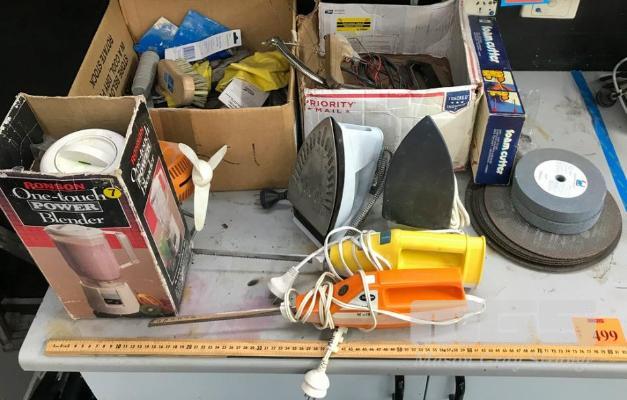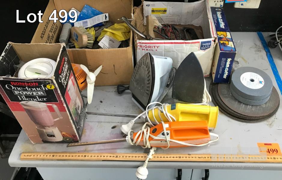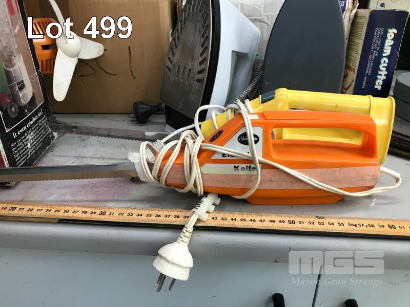 ASSORTED EQUIPMENT. ELECTRIC KNIVES, IRONS, FAN, BLENDER, HOT WIRE FOR CUTTING POLYSTYRENE AND PLASTERING TOOLS
