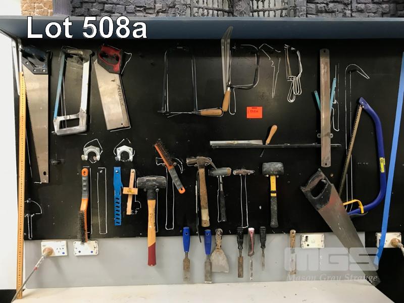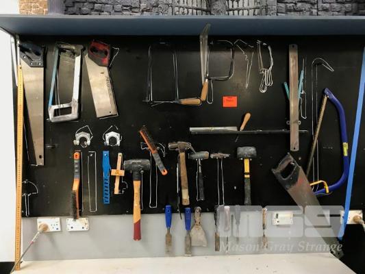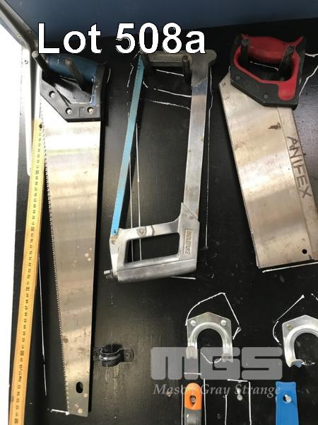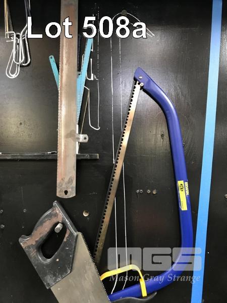 ASSORTED TOOLS. 4 WOOD SAWS, 2 HACK SAWS, 2 COPING SAWS. 4 HAMMERS/ MALLETS, 2 WIRE BRUSHES AND 6 CHISELS