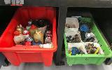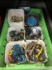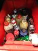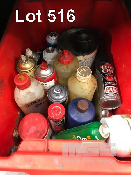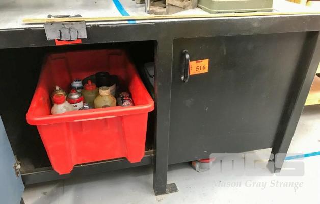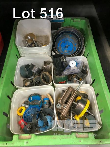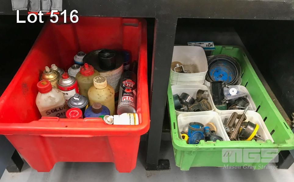 CONTENTS OF CUPBOARD. TUB OF HOLE SAWS, DRILLING JIG, DRILL BIT SHARPENER AND TUB OF LUBRICANTS AND POLISHERS