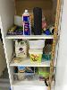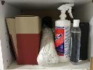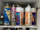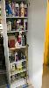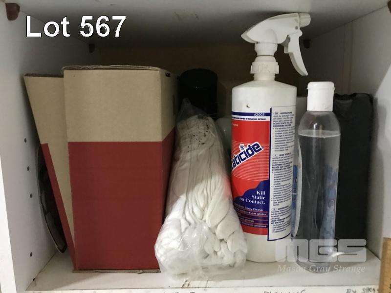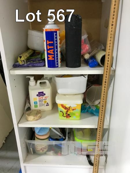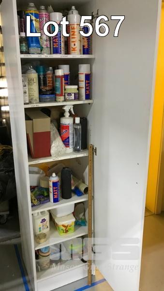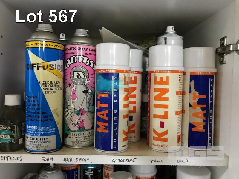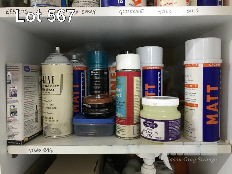 TALL CUPBOARD WITH USEFUL FILM ITEMS. DIFFUSION (SMOKE) IN A CAN. CANS OF DULLING SPRAY, FROST IN A CAN, WHITE COTTON GLOVES. SUNSCREEN FOR LOCATION SHOOTING