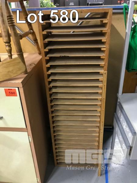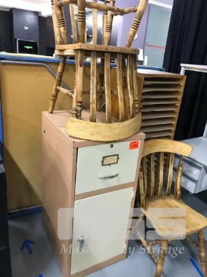 FILING CABINET ( W 48 CMS X H 120 CMS X D 63 CMS) FOLDING TABLE TENNIS TABLE. INCLUDES NET AND 4 PADDLES. CEL ANIMATION PAPER RACK. (W 42 CMS X H 136 CMS X D 39 CMS) 3 WOODEN COUNTRY CHAIRS