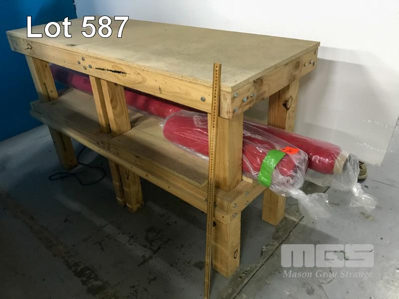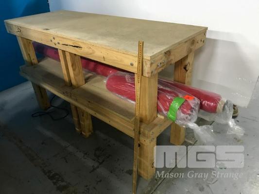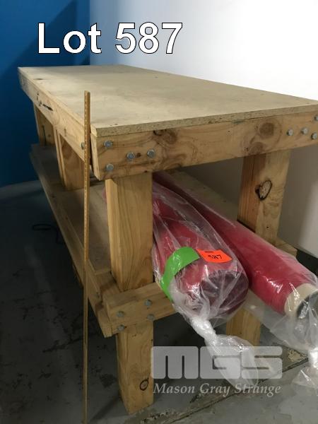RED AWNING MATERIAL AND TABLE (W 150 CMS X H 94 CMS X D 61 CMS)