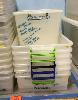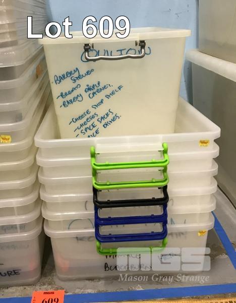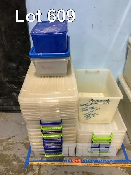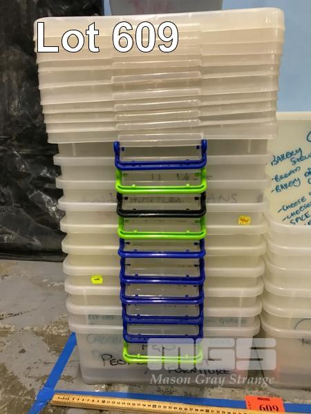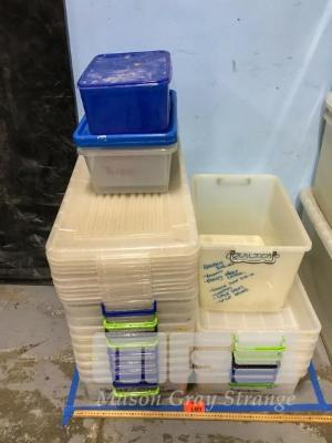 10 X LONG PLASTIC STORAGE BINS WITH LIDS. 3 X SMALL PLASTIC STORAGE BINS WITH LIDS. 7 X PLASTIC STORAGE BINS WITHOUT LIDS