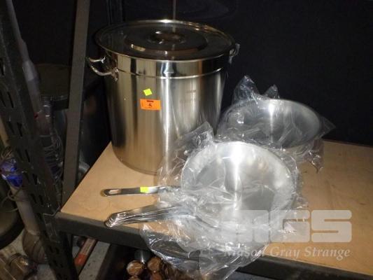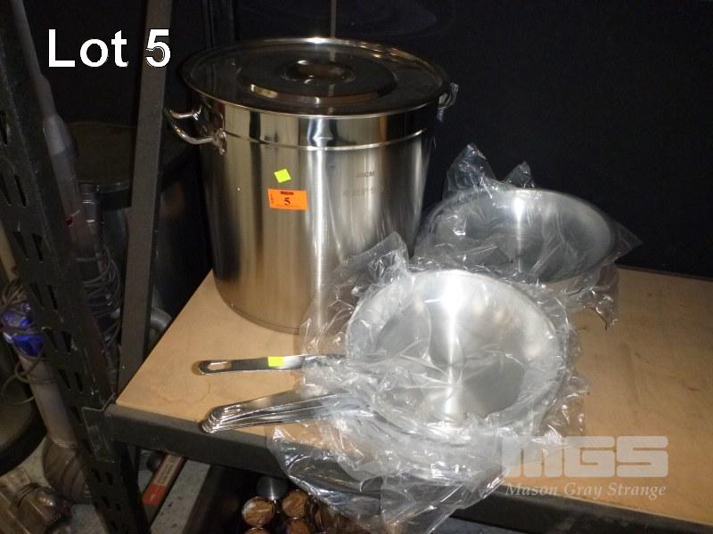 STAINLESS STEEL STOCK POT, 40cm & 10 x FRY PANS, 28 & 30cm