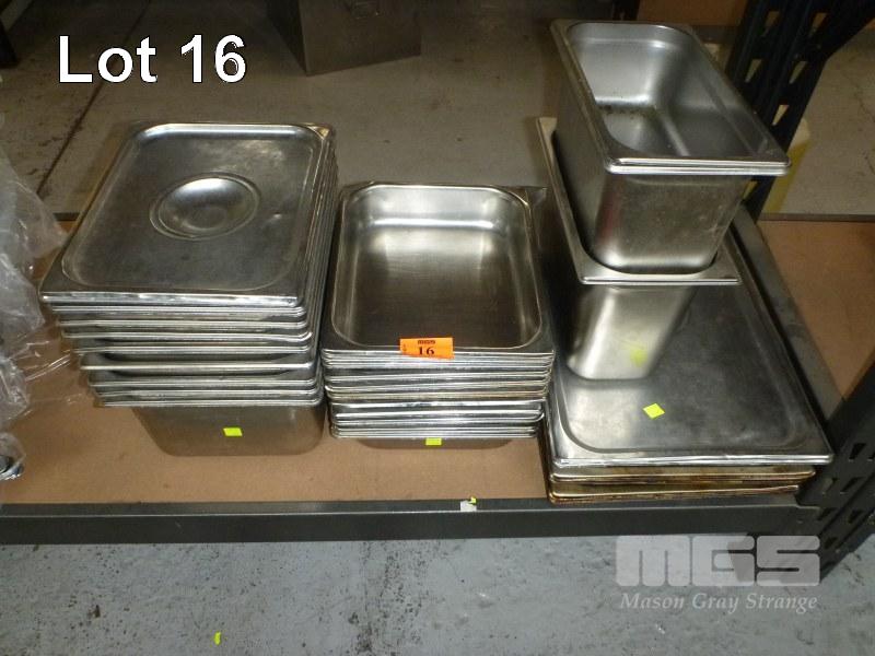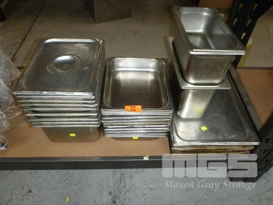 2 x STAINLESS STEEL FOOD PANS, 53 x 33 x 7cm WITH LIDS, 8 x STAINLESS STEEL FOOD PANS, 33 x 26 x 15CM WITH 4 x LIDS & 11 x STAINLESS STEEL FOOD PANS, 33 x 26 x 7cm, WITHOUT LIDS