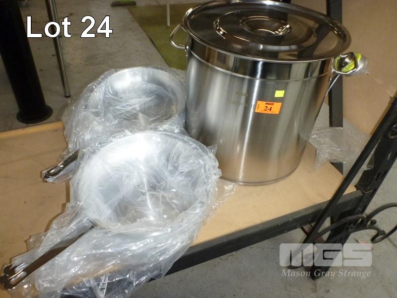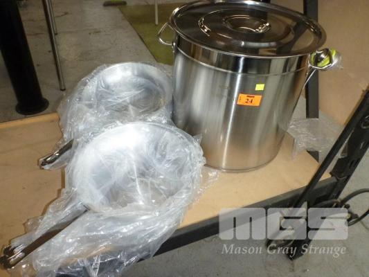 STAINLESS STEEL STOCK POT, 40cm & 10 x FRY PANS, 30cm