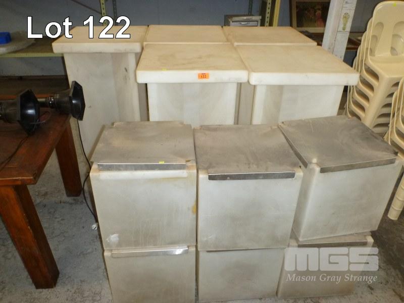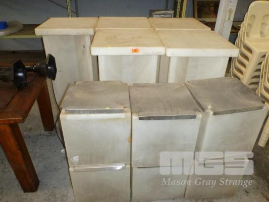 5 x POLY BAR TABLES, EACH 60 x 60cm & 6 x POLY TABLES, EACH 43 x 43cm