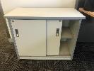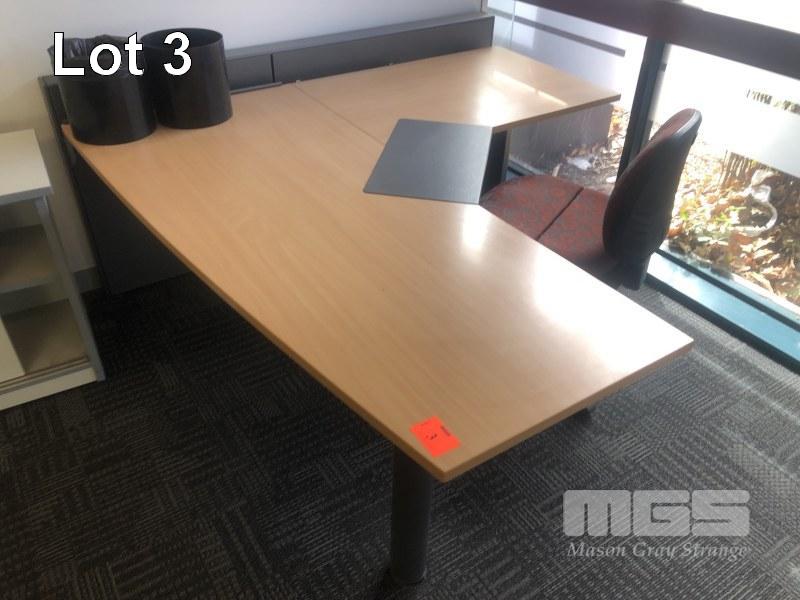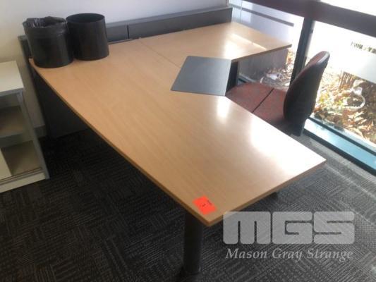 CORNER DESK WITH RETURN, BEECH LAMINATE TIMBER, STEEL FRAME 1800 x 1940mm, 3 x EPO'S, TYPIST CHAIR, 2 x WASTE PAPER BINS & GREY LAMINATE CREDENZA, 900 x 450mm