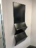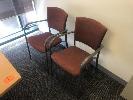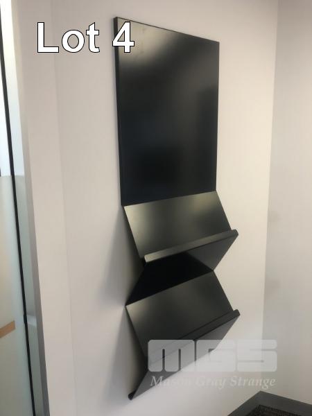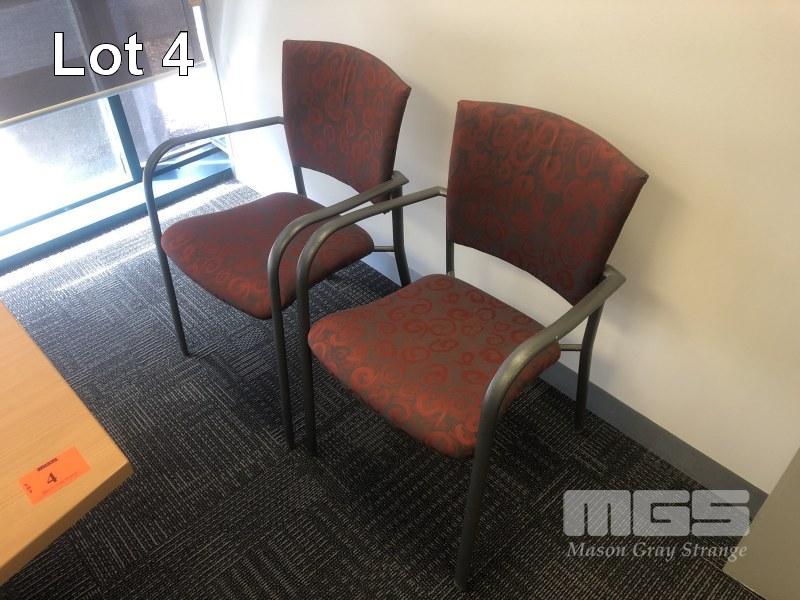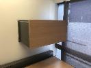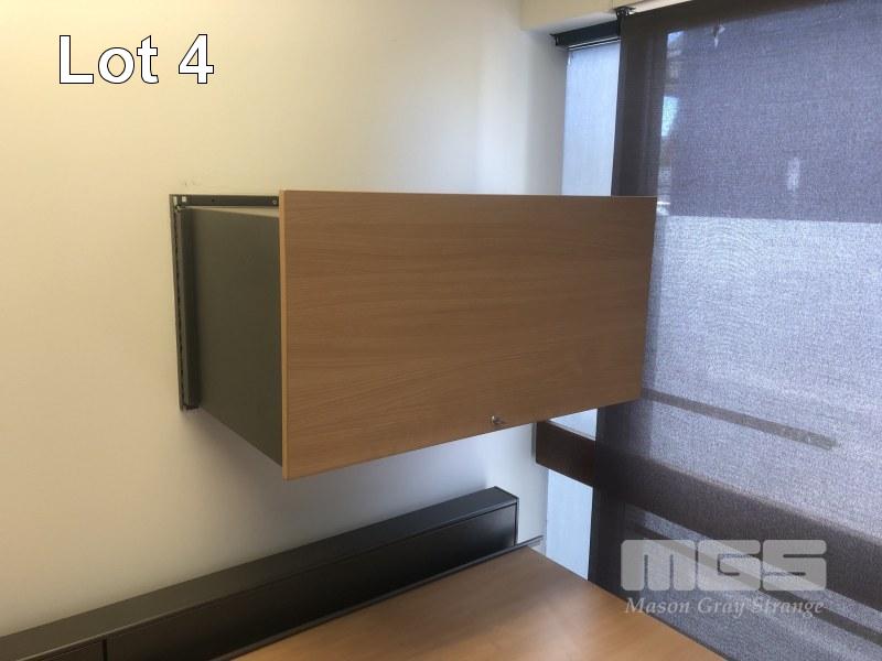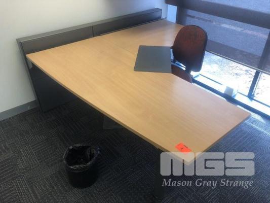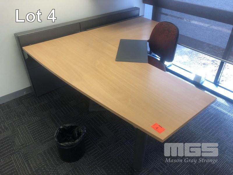 CORNER DESK WITH RETURN, BEECH LAMINATE TIMBER, STEEL FRAME 1800 x 1940mm, 3 x EPO'S, TYPIST CHAIR, 2 x WASTE PAPER BINS & GREY LAMINATE CREDENZA, 900 x 450mm, 2 VISITORS CHAIRS, RED FABRIC, STEEL FRAME, MATCHING LOCKABLE WALL MOUNT CABINET & WALL MOUNT STEEL BOOKLET HOLDER
