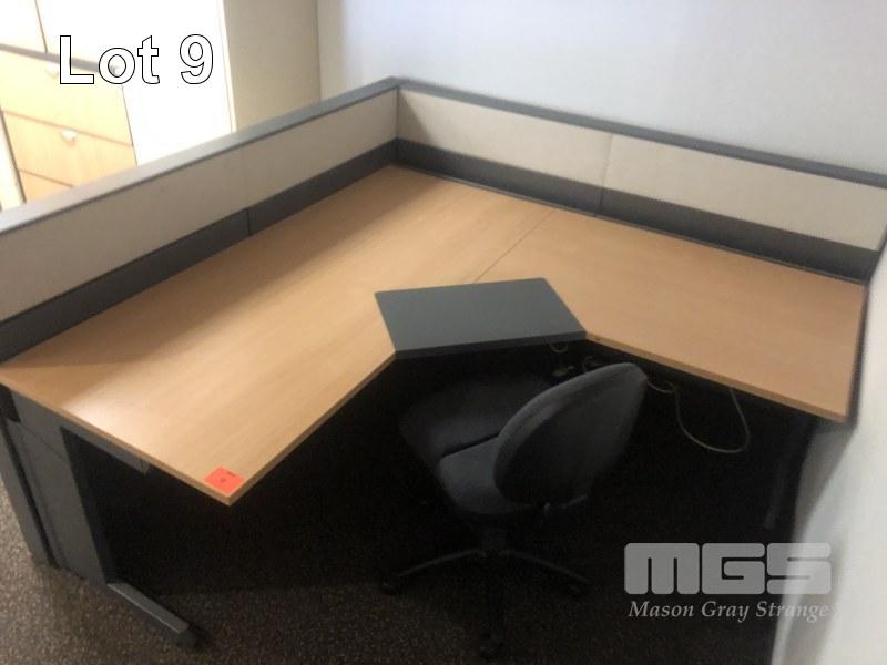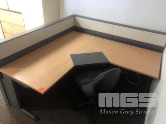 CORNER DESK WITH RETURN, BEECH LAMIANTE, 1900 x 1900mm, GREY STEEL FRAME,