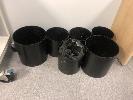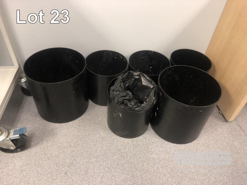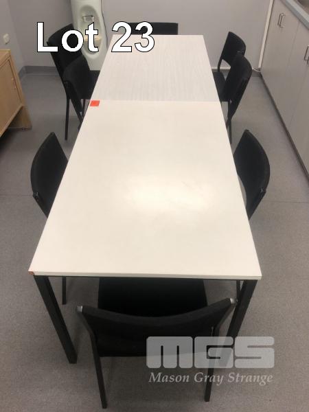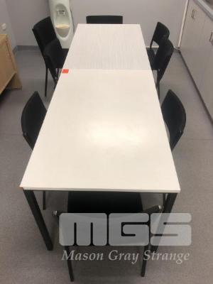 2 x LAMINATE KITCHEN TABLES, 1200 x 750mm, 8 x BLACK FABRIC CHAIRS, STEEL FRAME & 6 x WASTE BINS